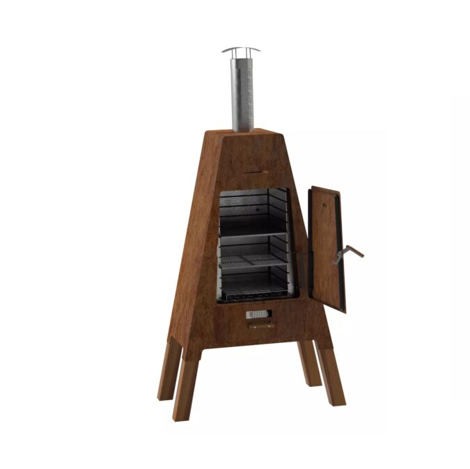 Ausgestattet mit einem Thermometer und einer Luftregulierung für eine präzise Kontrolle des Räucherprozesses, mit einem Feuerplatz unter der Kammer für eine gleichmäßige Wärmeabgabe.