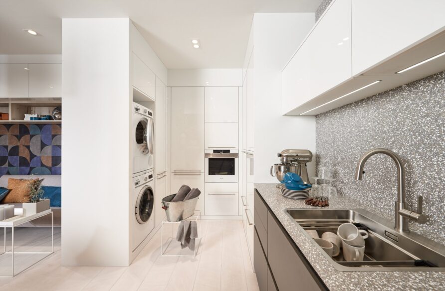 - Höhenverstellbare Arbeitsflächen: Die Arbeitsflächen sollten auf die richtige Höhe eingestellt sein, um Rückenschmerzen zu vermeiden, vor allem, wenn viel gewaschen oder gebügelt wird.