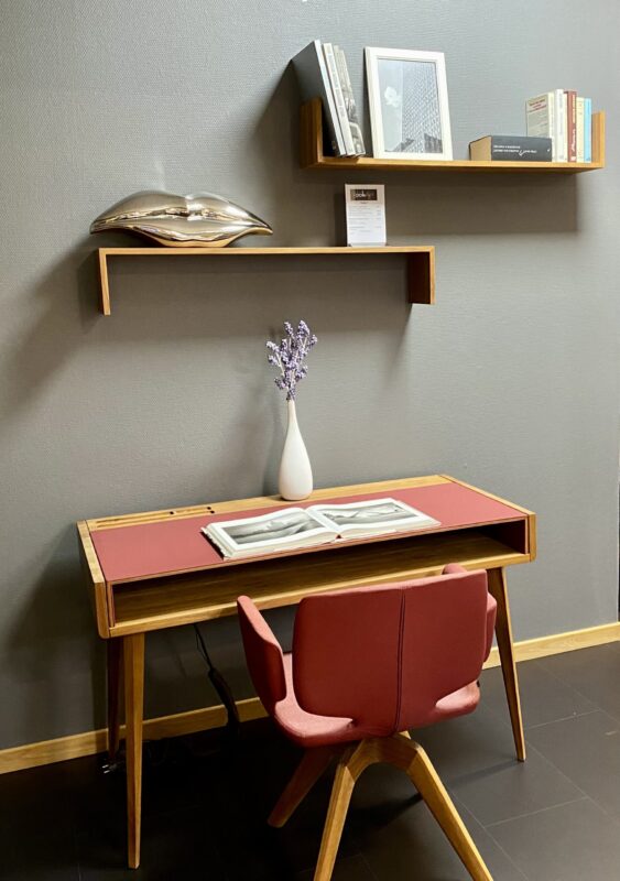 Découvrez l’ensemble avec la chaise et les étagères dans notre salle d’exposition.